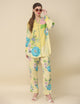 Step into a world of luxury with the Olive Ember Coord Set, crafted from premium German silk for an opulent feel. This statement outfit features a vibrant red and olive green palette, with bold swirl and leaf motifs cascading across the fabric. The relaxed-fit shirt, with its mandarin collar and contrasting cuffs, pairs effortlessly with wide-leg pants, creating a flowy silhouette that's both comfortable and striking. Perfect for elegant daywear or casual evening outings, this set ensures you stand out with its unique patterns and silky sheen