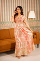 Step into elegance with this dress, featuring a stunning gradient blend of soft mint green and vibrant amber hues. This sleeveless maxi dress is adorned with intricate gold floral embroidery and shimmering accents that make it perfect for any special occasion. The cascading ruffle hem adds a playful touch, while the tassel tie detail at the neckline brings a hint of boho charm. Designed for comfort and style, this dress will have you turning heads effortlessly. Pair it with strappy sandals or heels for a flawless look.