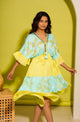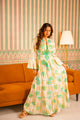 This dress is a stunning full-length kaftan-style piece, perfect for a luxurious and elegant look. It features intricate golden thread embroidery in floral motifs that are highlighted with bright pink and green accents. The lightweight fabric drapes beautifully, giving it a flowy and comfortable feel. The dress has a cinched waist with an adjustable tie to enhance the figure while maintaining a loose, airy silhouette. Bell sleeves add a touch of bohemian charm, making this dress ideal for both casual wear and special occasions.